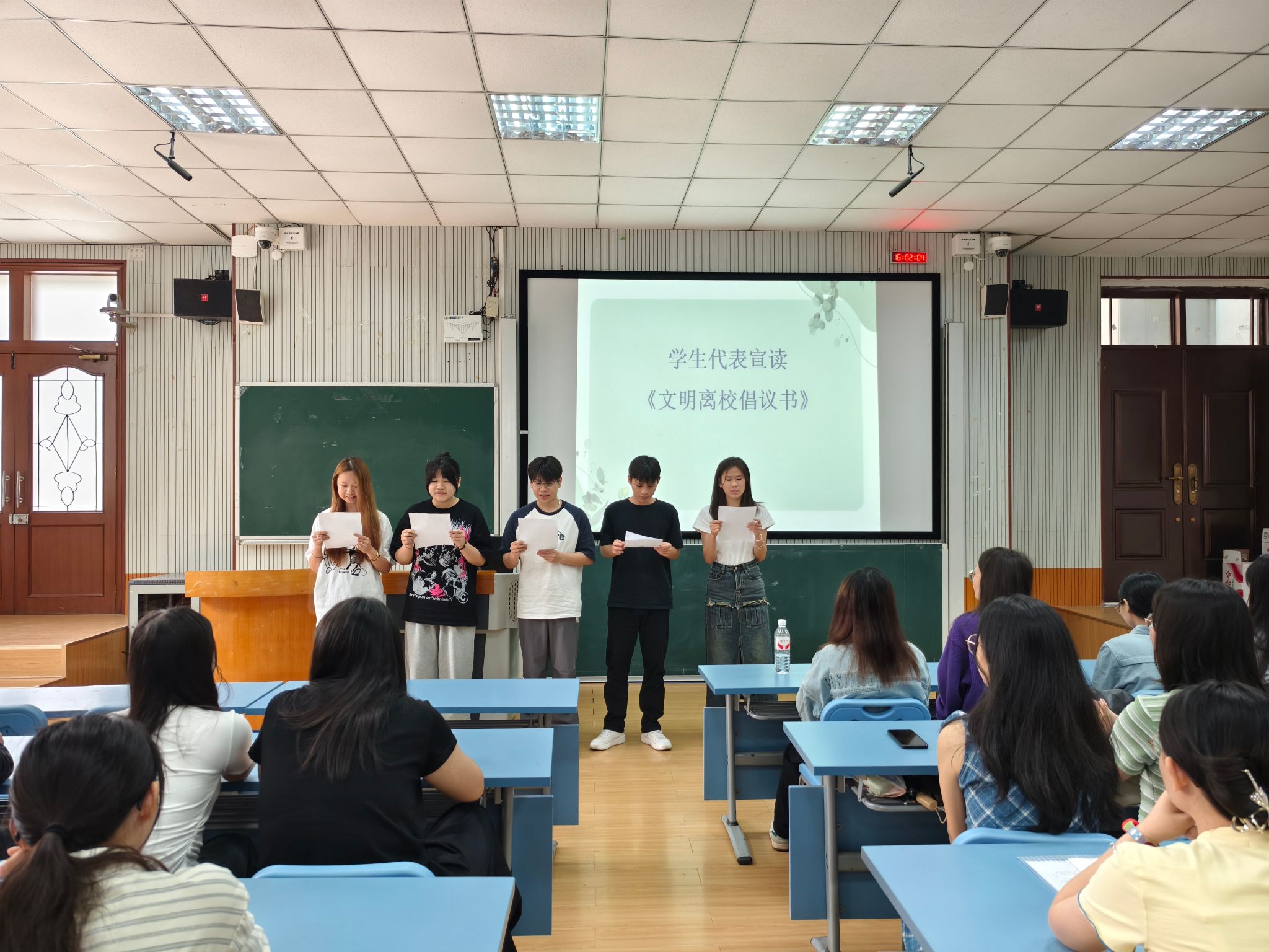 会上,潘夏宁副书记向毕业生通报了公司2025届毕业生当前的就业和升学情况,并结合今年就业形势作就业再动员。希望同学们要充分认清当前的就业形势,调整就业心态,找准自身定位,积极参加各类招聘活动,树立“先就业再择业”的观念。同时,强调了毕业生文明离校工作的重要性,详细介绍了毕业生离校前的各项准备工作,包括离校手续办理流程事项、校纪校规、就业安全等。会议最后,各班员工代表宣读了《文明离校倡议书》。