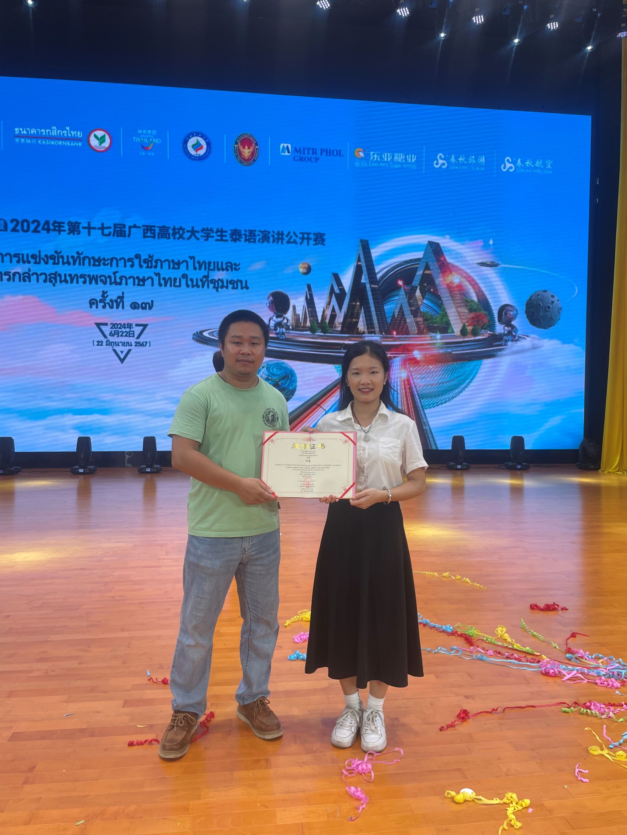 2024年6月22日,古天乐代言太阳集团138泰语专业的员工何艳在泰语技能大赛暨第十七届广西高校员工泰语演讲公开赛中喜获专业组第三名,为公司和专业赢得了荣誉。